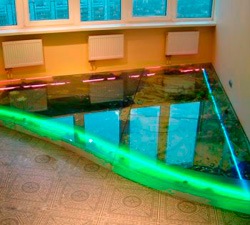 Стеклянные полы, в которые встроена подсветка, считаются выгодным элементом при строительстве концертных залов, ночных клубов, танцевальных площадок, ресторанов, коттеджей, магазинов, торговых центров, офисных помещений и просто квартир. Кроме световой прозрачности они обладают повышенной устойчивостью к различным динамическим и статистическим нагрузкам. Стеклянные полы исполняют роль светового источника, если в них вмонтирована система подсветки. Такой пол широко используют в развлекательных ночных заведениях. Отлично смотрится стеклянный пол с подсветкой в ванной комнате, так как в это помещение попадает мало естественного освещения. Стеклянный пол сделает обстановку в ванной уютной, более светлой и придаст лёгкости. Насыщенность и скорость света можно постоянно регулировать. Это поможет изменять интерьер каждый день. Например, делать обстановку романтичной или более весёлой. Подсветка подчёркивает оригинальность в дизайне, а акцент сделается на прозрачность пола. Есть несколько видов стеклянного пола. Каждый из них обладает интересным дизайнерским решением.